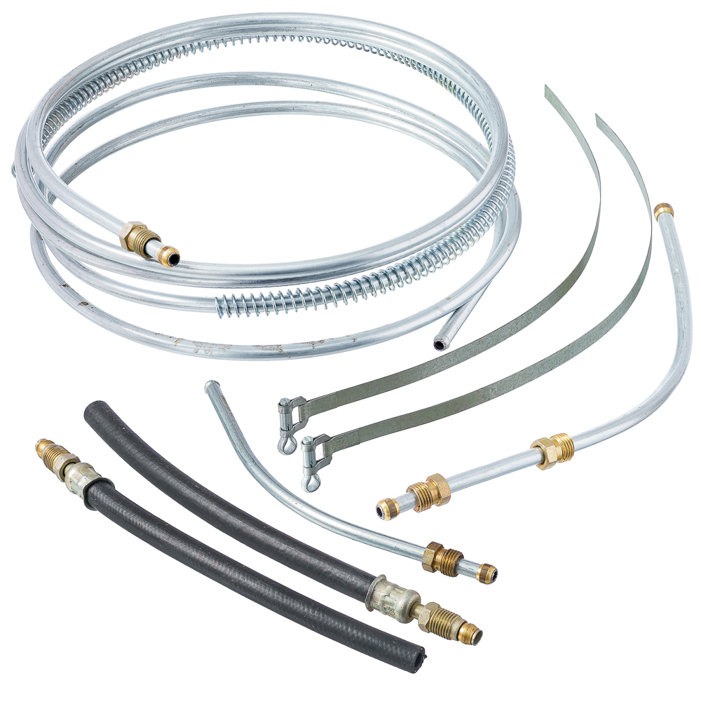 Штуцеры идентичны оригинальным, имеют такой же размер, диаметр и шаг резьбы. Трубки выполнены с запасом 3-5 % от оригинальной длины. На магистральную трубку устанавливается защитная пружина для защиты от перетирания о кузов. Устанавливаемая пружина являются точной копией оригинальной, выполнена по заводскому чертежу. Покрытие - белый цинк.