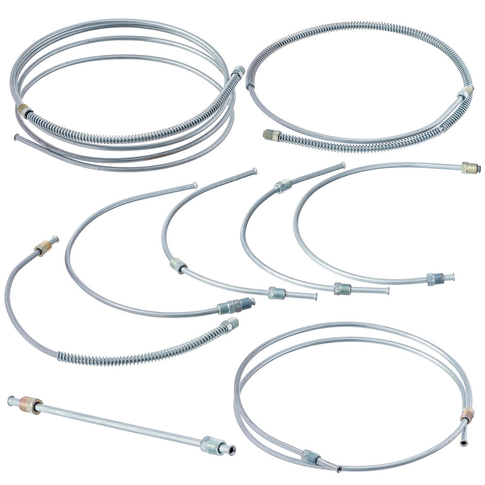 Штуцеры идентичны оригинальным, имеют такой же размер, диаметр и шаг резьбы. Трубки выполнены с запасом 3-5 % от оригинальной длины. При изготовлении трубок применяются защитные пружины, которые устанавливаются на длинную магистральную трубку и трубки, идущие по заднему мосту для защиты от перетирания о кузов. Устанавливаемые пружины являются точной копией оригинальных. Выполнены по заводскому чертежу. Покрытие - белый цинк.