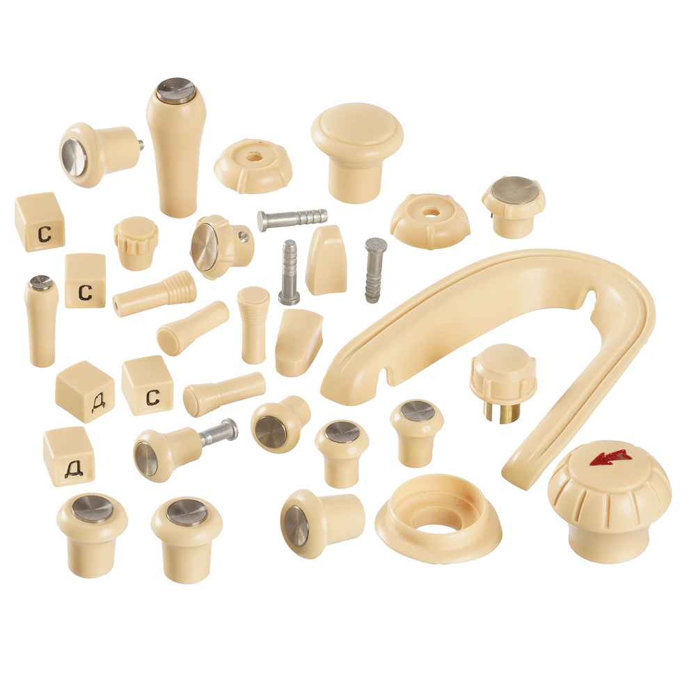 Комплект включает в себя все необходимые кнопки и ручки салона для ГАЗ 21 первой серии. Подлокотники в комплект не входят.