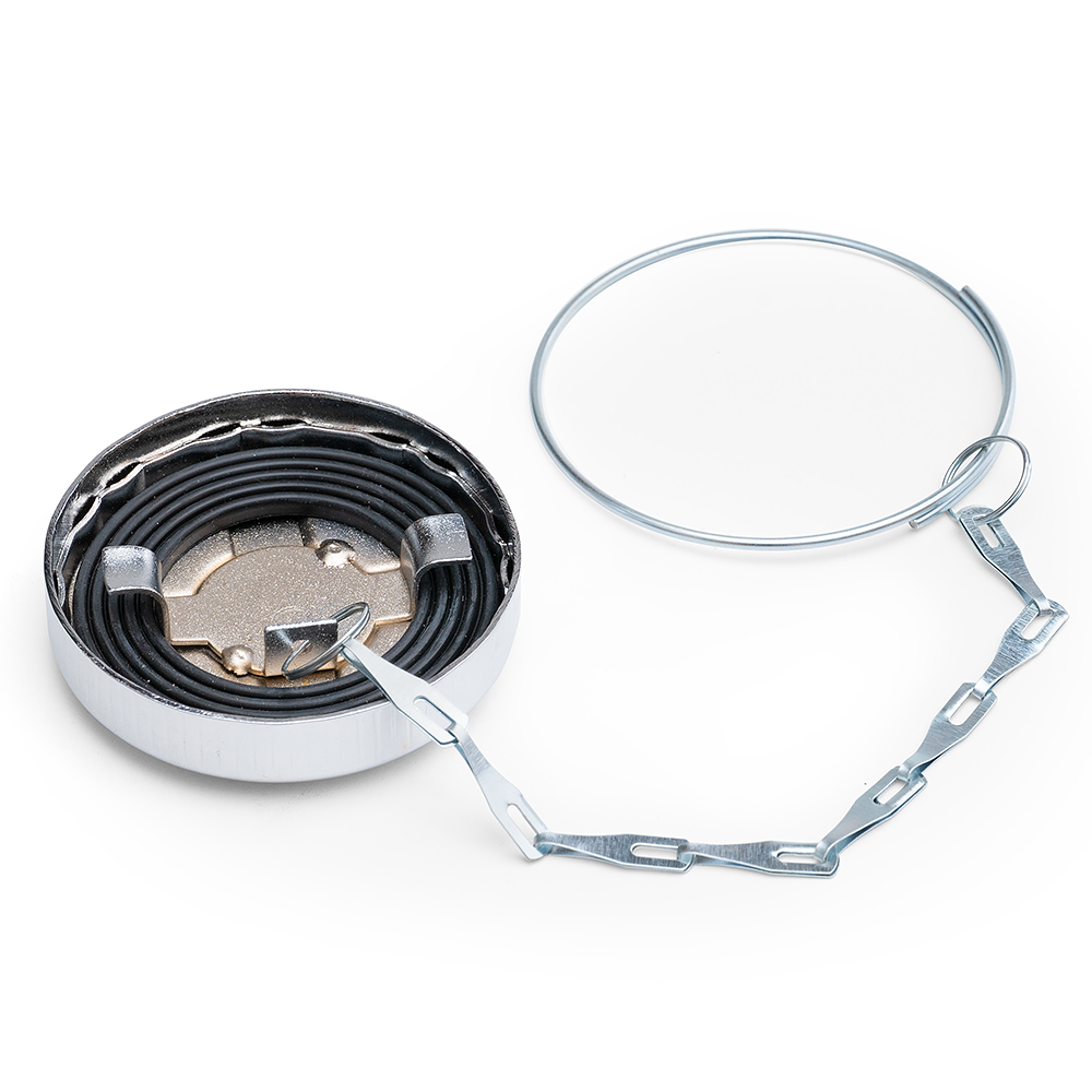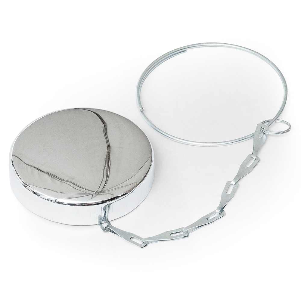Хромированная пробка бензинового бака в сборе с цепочкой и уплотнительной прокладкой на Москвич 402, 407, 403, 408, 412, 2140, ИЖ 412, 2125, 2715 и их модификации, а также ЗАЗ 965 Горбатый Запорожец.